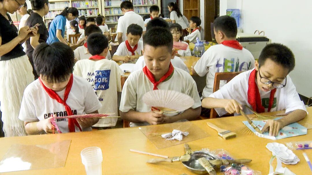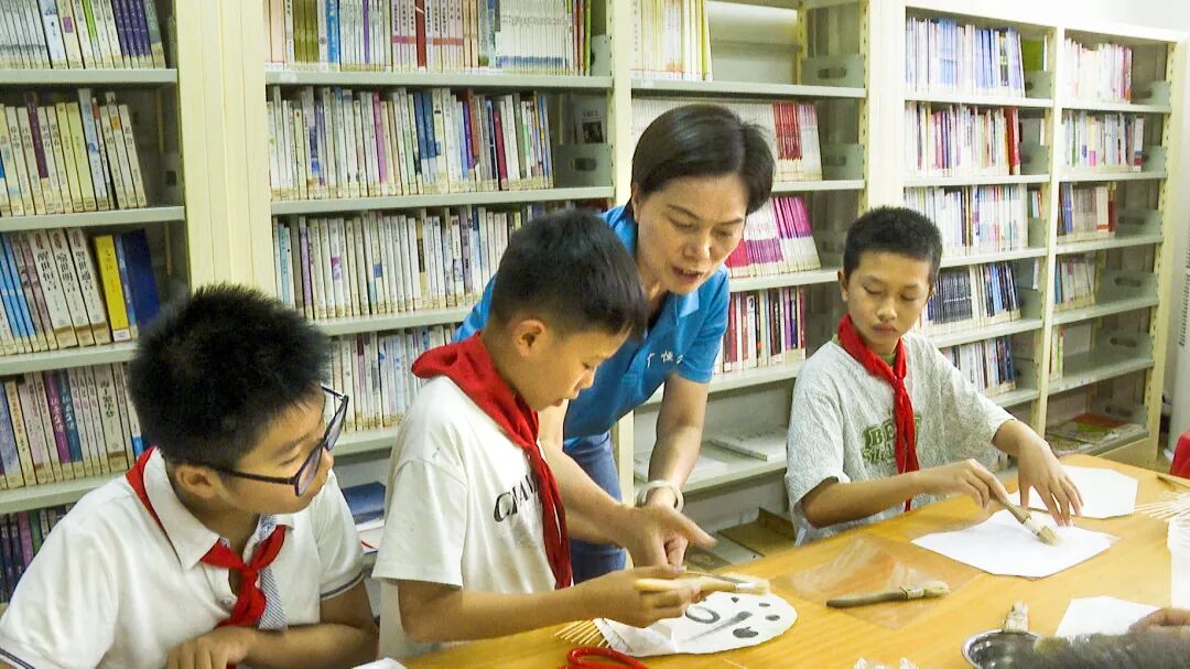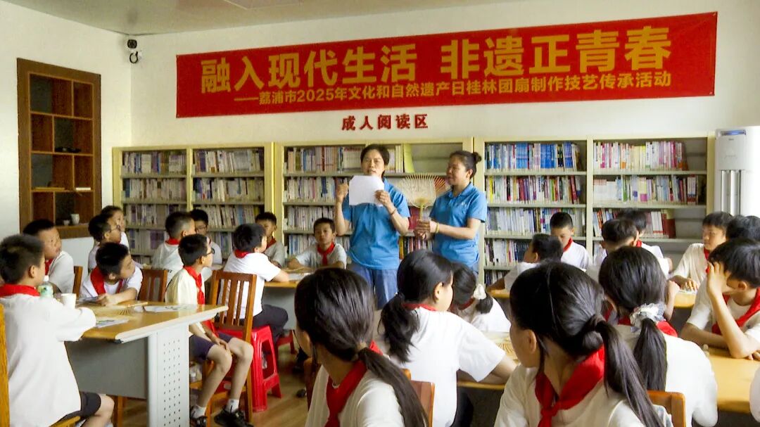 在荔浦市图书馆修仁分馆活动现场,修仁镇中心小学学生代表沉浸式体验非遗技艺的文化魅力。荔浦文场展演曲调优美,荔浦风物传说讲解娓娓道来,修仁茶体验区茶艺精湛。在非遗团扇制作技艺展示中,非遗传承人教授学生们糊纸、缝合、装饰。学生们认真学习,有模有样地将制作团扇的骨架摊平、描画、捶打、裁剪。不一会儿工夫,一个个精美的团扇呈现在眼前。学生们开心地分享自己的作品,流露着对非遗文化的喜爱。