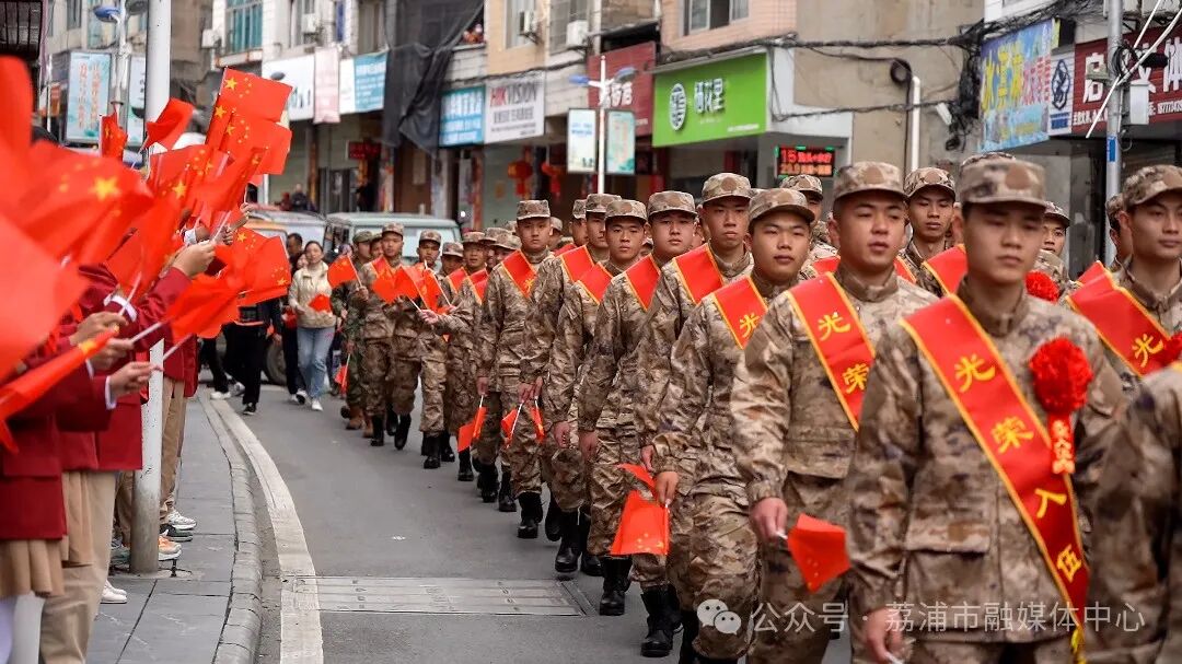 短暂的相聚后,凌传飞宣布登车命令。欢送新兵的车辆从市人武部出发,沿滨江路、市场路、荔柳路等路段进行欢送游行。醒狮队敲锣打鼓,亲朋好友紧跟其后,场面十分热闹。沿途群众自觉排成两排,挥舞着旗帜欢送即将奔赴军营的家乡子弟。巡游结束后,新兵们带着家乡人民的重托,踏上了接兵大巴,开启军旅生涯和人生新征程。
