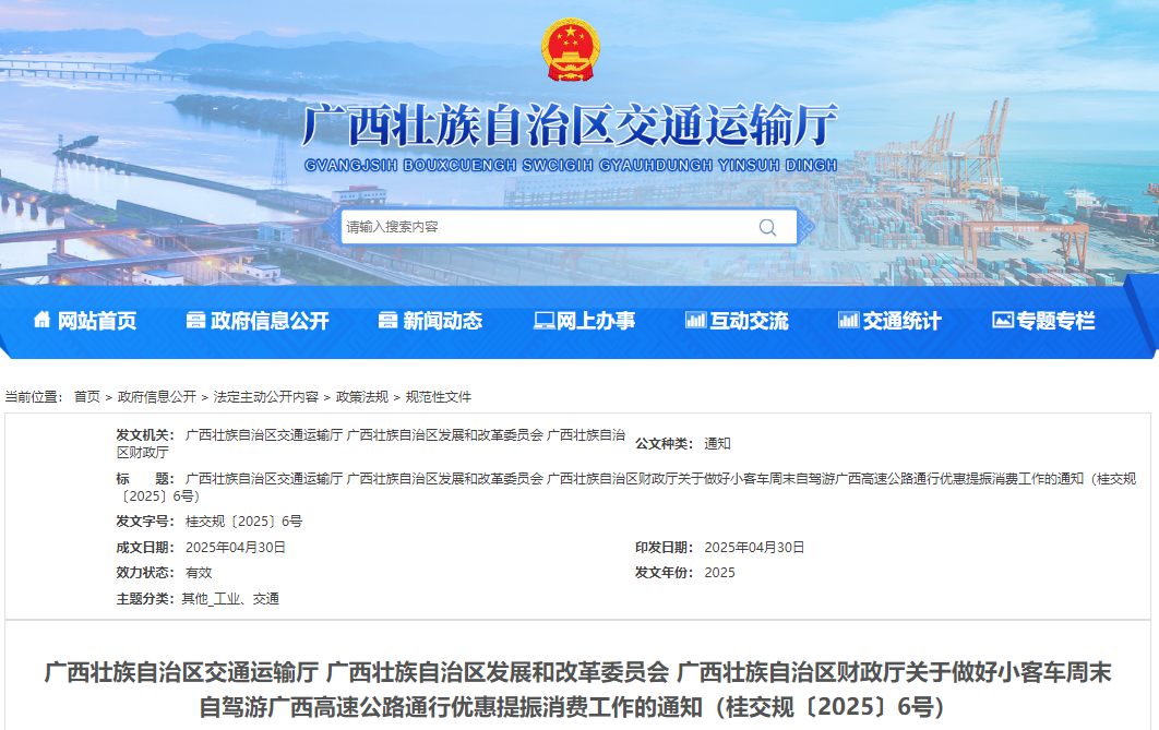 为深入贯彻落实全国两会和中共中央办公厅、国务院办公厅《提振消费专项行动方案》及2025年粤桂东西部协作联席会议精神,持续促进广西壮族自治区消费市场恢复和扩大,近日,广西壮族自治区交通运输厅联合广西壮族自治区发展和改革委员会、广西壮族自治区财政厅印发《关于做好小客车周末自驾游广西高速公路通行优惠提振消费工作的通知》(以下简称《通知》)。