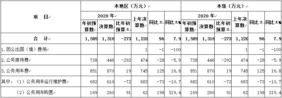 2020年,荔浦市本级一般公共预算安排的“三公”经费支出合计1,316万元,同口径比上年决算数增加96万元,增长7.9%,比年初预算数减少273万元,其中: