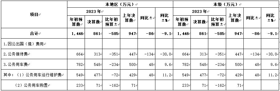 2023年,荔浦市及本级一般公共预算安排的“三公”经费支出合计861万元,同口径比上年决算数减少86万元,下降9.1%,比年初预算数减少585万元,其中: