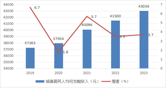 图6 2019- 2023年城镇居民人均可支配收入及增长速度