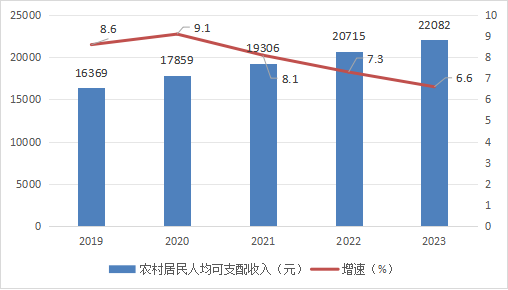 图7 2019-2023年农村居民人均可支配收入及增长速度