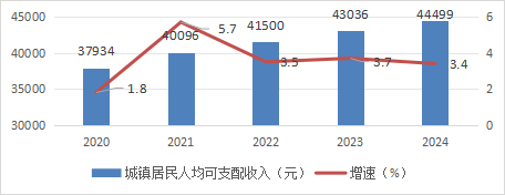 图6 2020- 2024年城镇居民人均可支配收入及增长速度