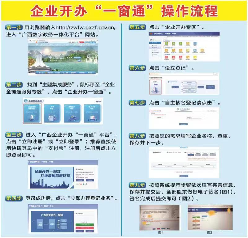 申请人通过广西数字政务一体化平台注册并在线上提交申请材料。从企业名称核准到提交设立登记申请、材料审核,全程实行网上办理,实现外资企业办理注册登记“零见面、零跑路、零费用”。