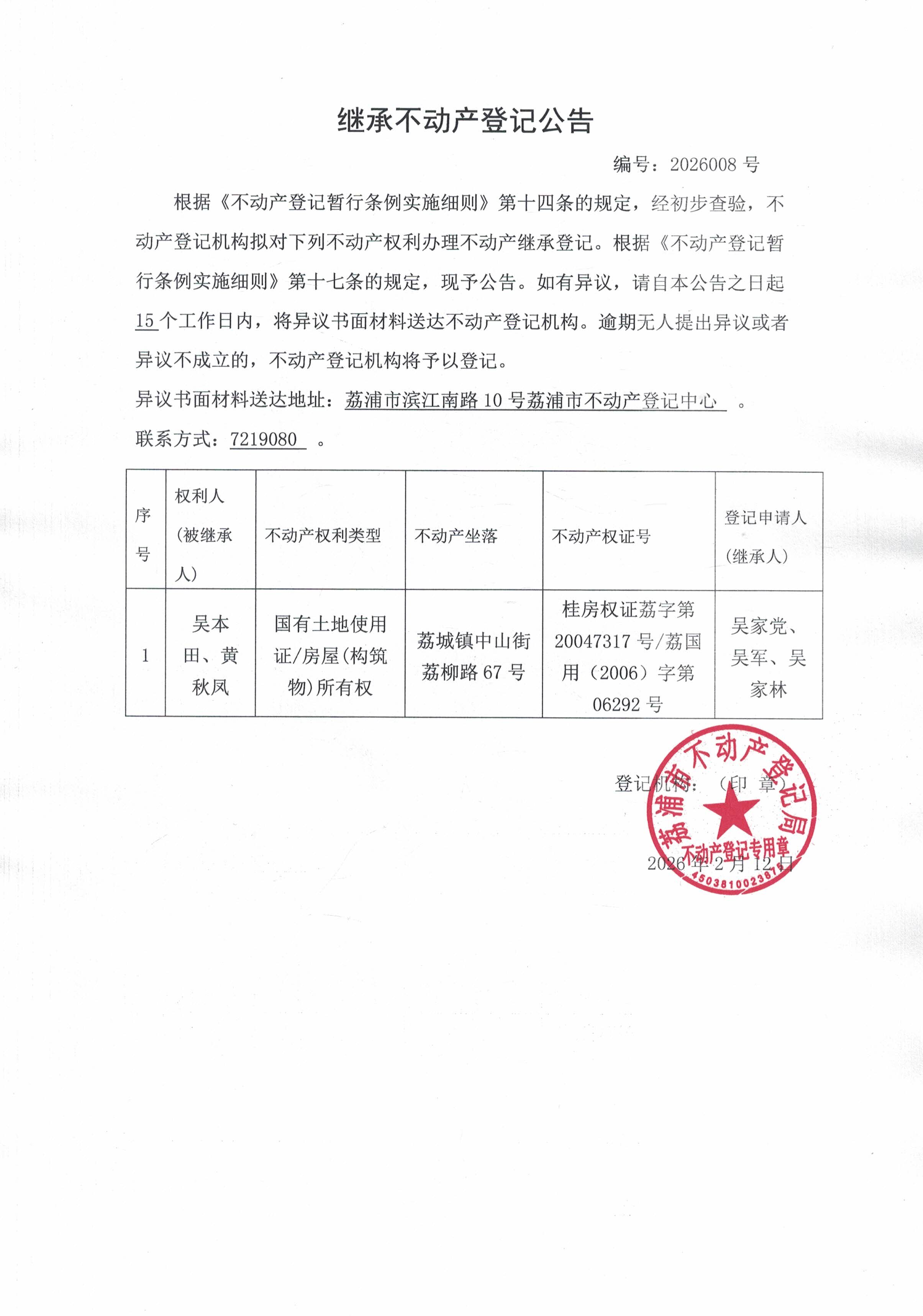 继承不动产登记公告2026008号