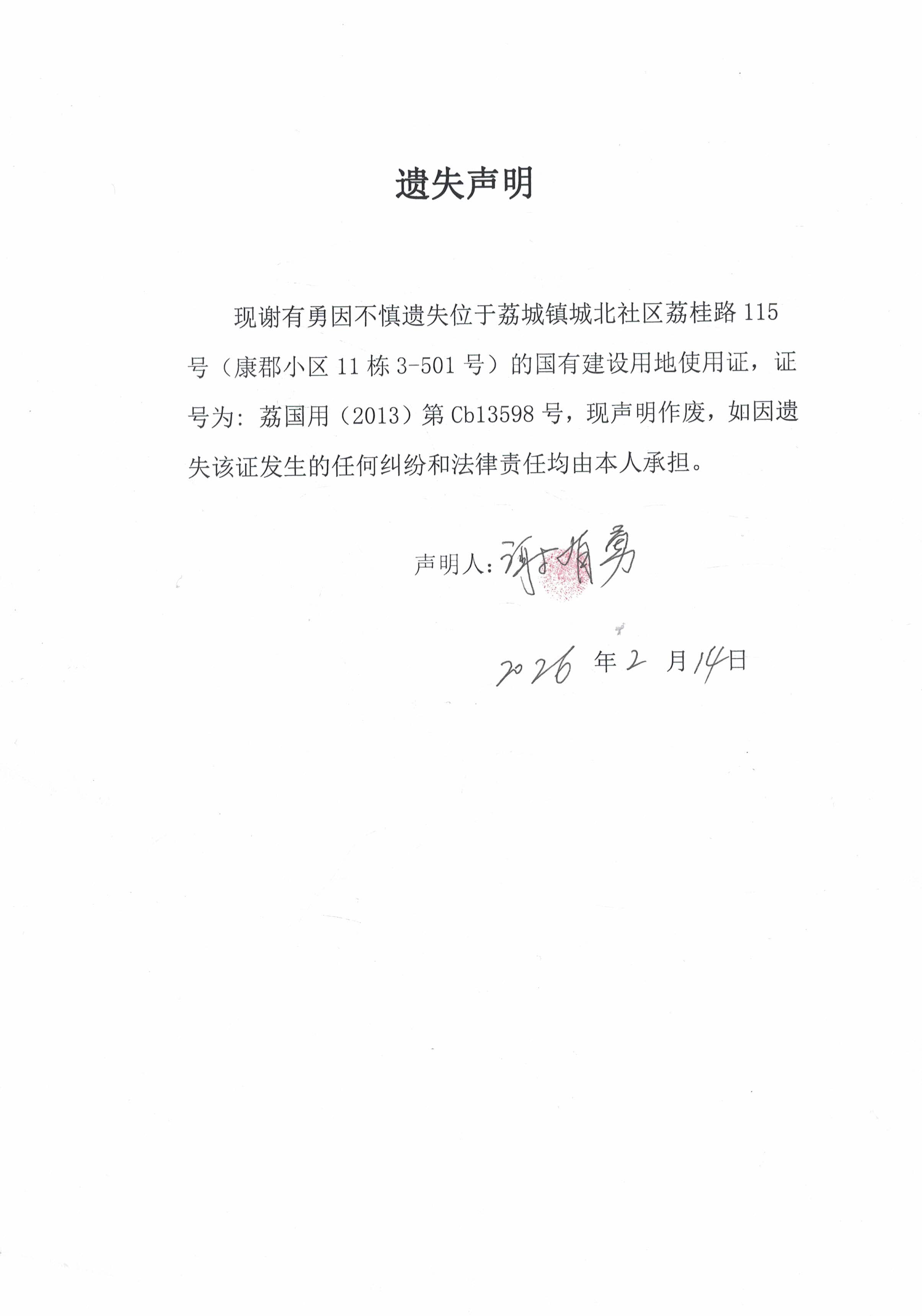 谢有勇 遗失声明