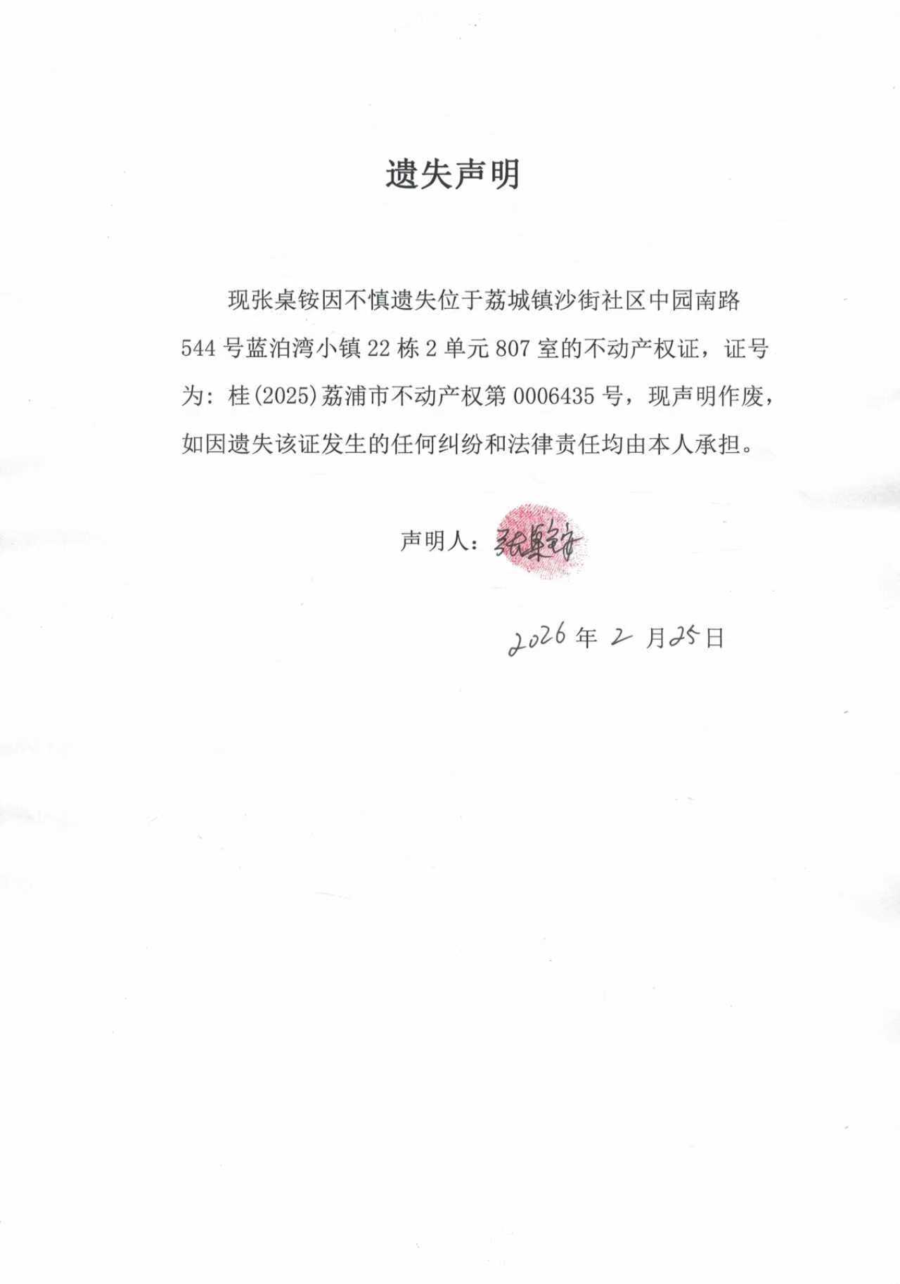 张桌铵 遗失声明