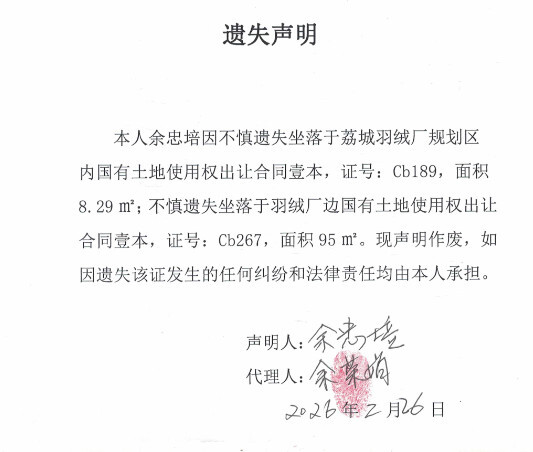 余忠培 遗失声明