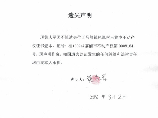 黄庆军 遗失声明