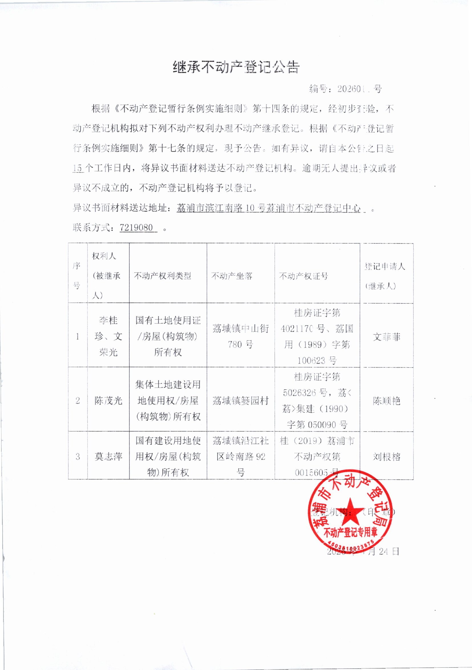 继承不动产登记公告2026011号