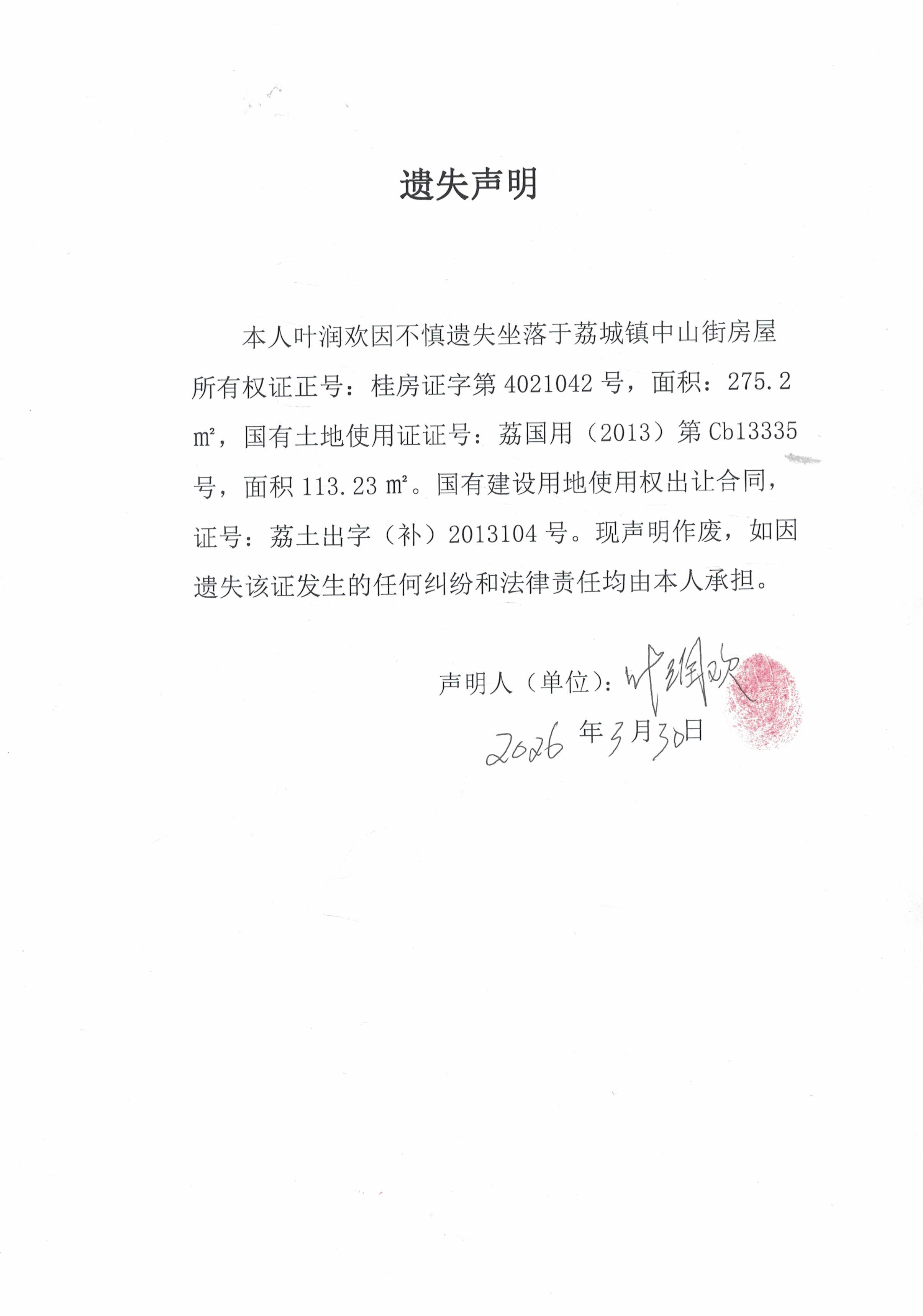叶润欢遗失声明