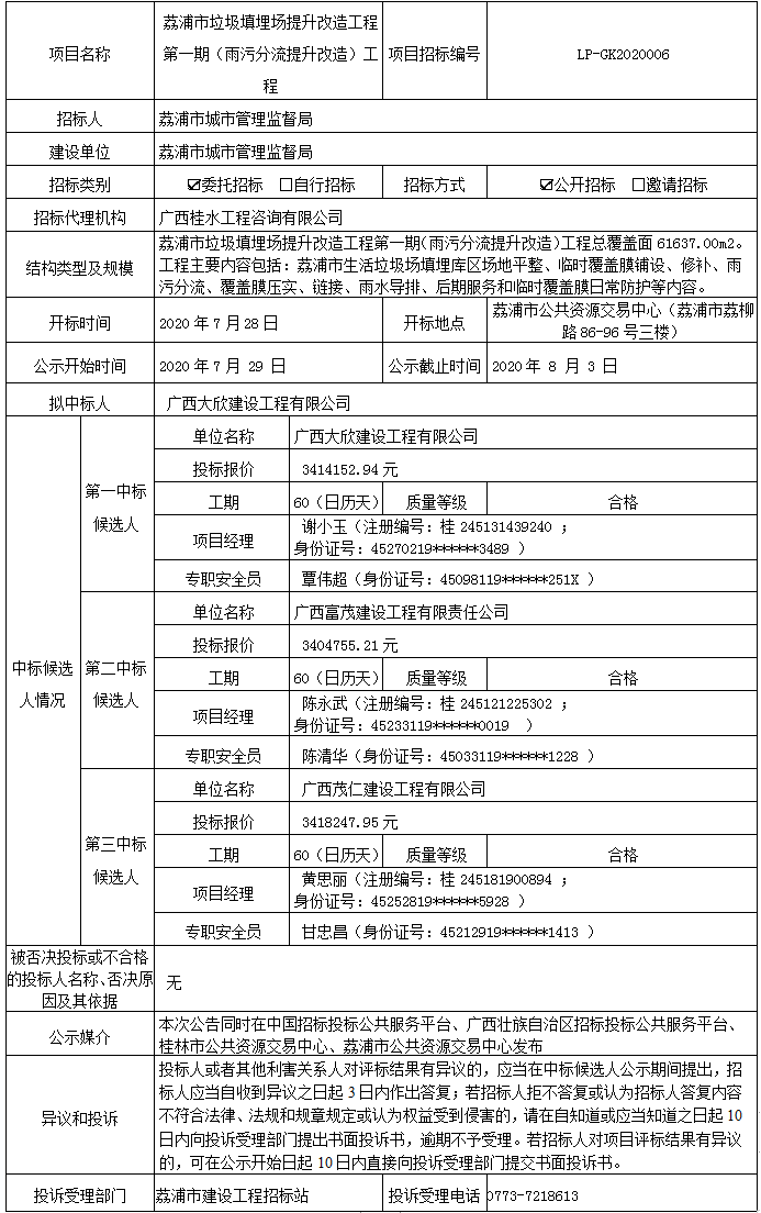 荔浦市垃圾填埋场提升改造工程第一期(雨污分流提升改造)工程中标候选人公示