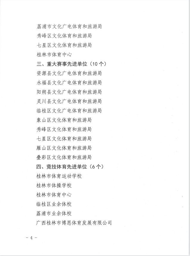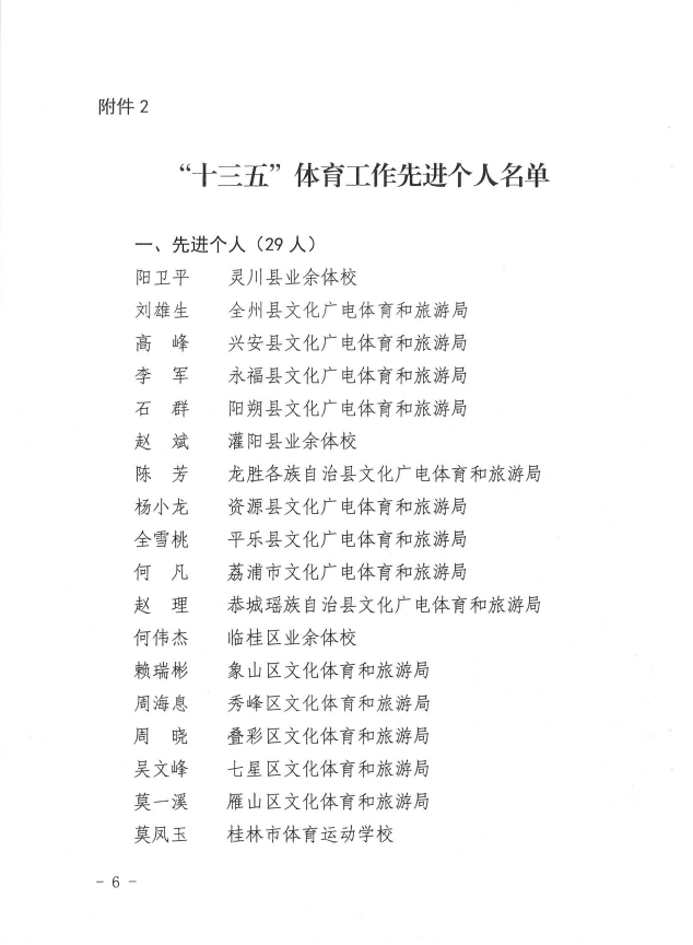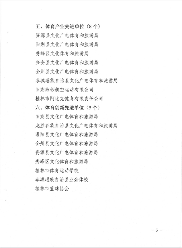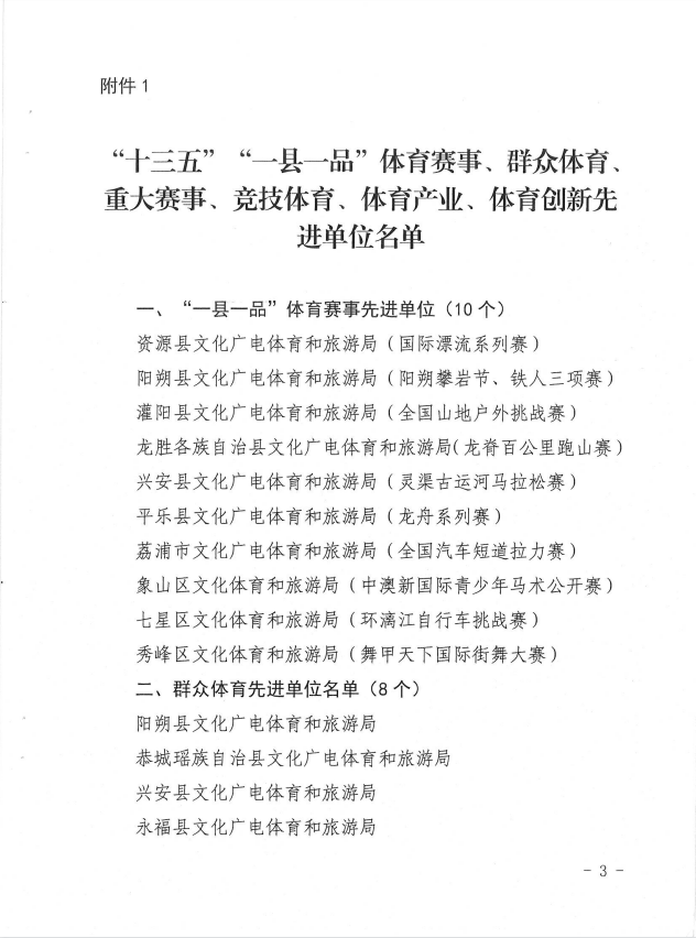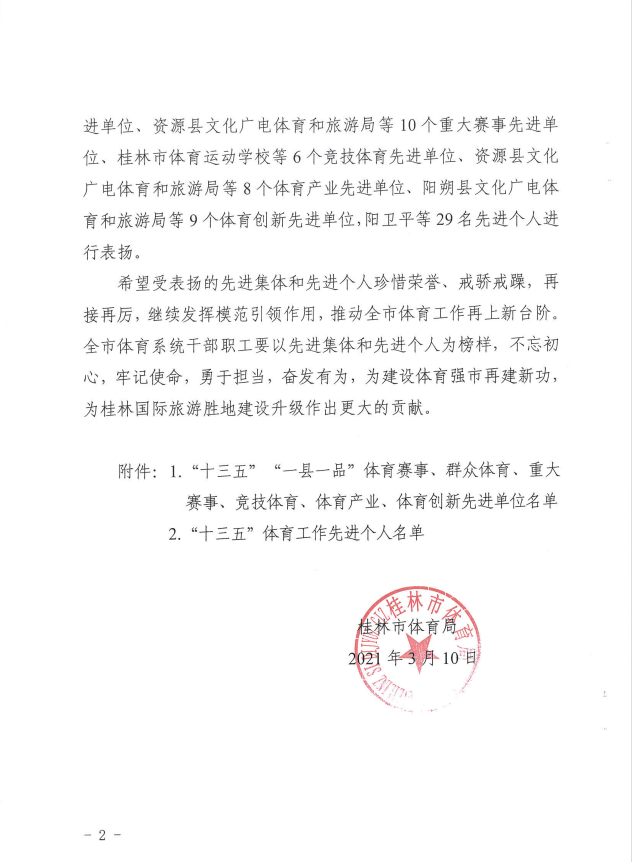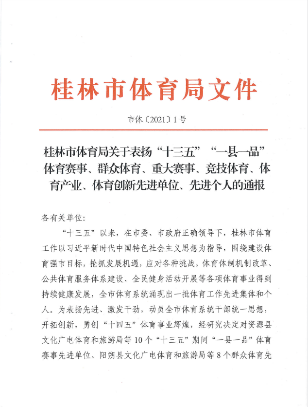 桂林市体育局关于表扬“十三五”“一县一品”体育赛事、群众体育、重大赛事、体育竞技体育、体育产业、体育创新先进单位、先进个人的通报