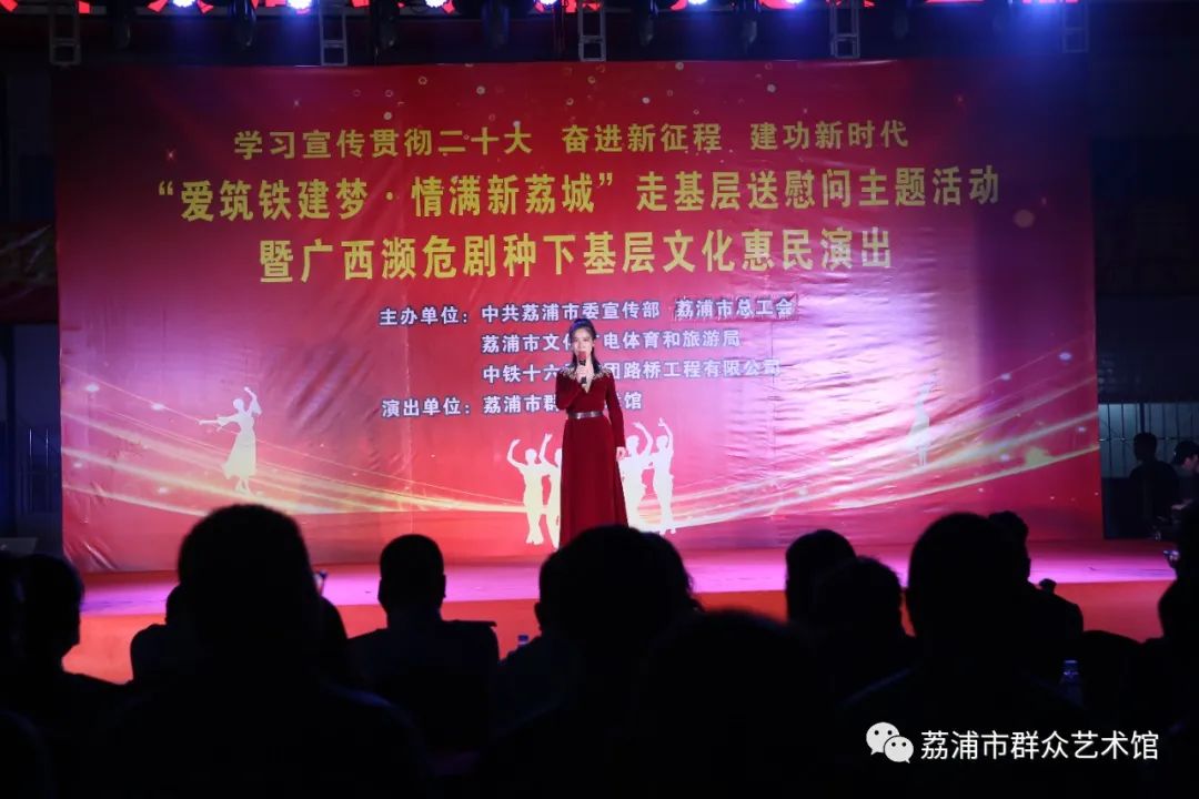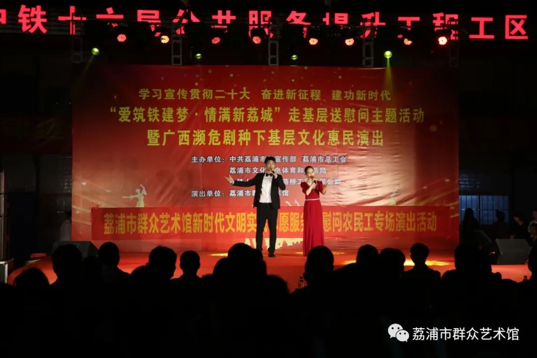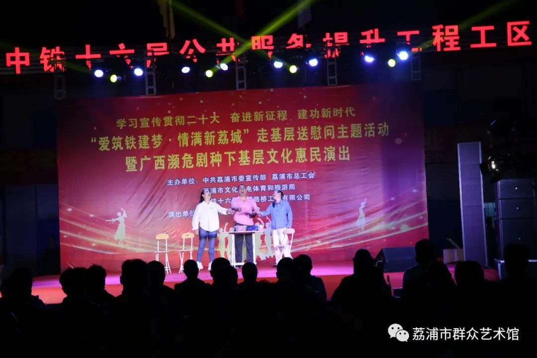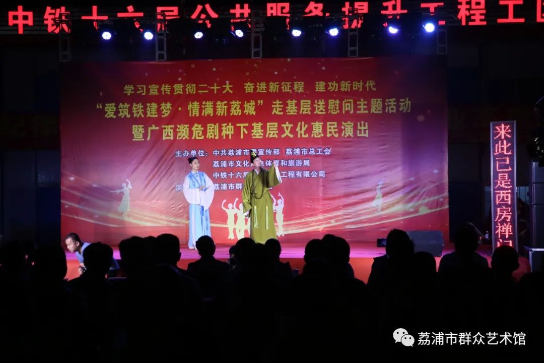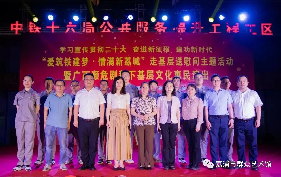 5月25日晚,中铁十六局集团路桥工程有限公司工会与荔浦市文化广电体育和旅游局工会在中铁十六局集团路桥工程有限公司荔浦项目部联合举行“爱筑铁建梦·情满新荔城”走基层送慰问主题活动暨广西濒危剧种下基层文化惠民演出文艺晚会。荔浦市政协副主席、总工会主席张维娟,荔浦市文化广电体育和旅游局局长曾妍、副局长詹勋富,荔浦市公安局副局长蒙春松,中铁十六局集团路桥工程有限公司党委常委、工会主席武晓丽,工会办主任刘丽娟,荔浦项目部党支部书记刘庆国、项目经理马良等领导及项目房建工区工人等200余人现场观看了晚会文艺演出。