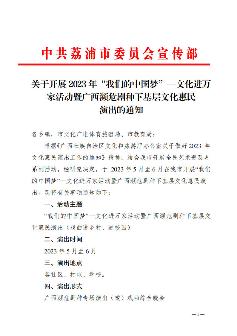 【组织开展群众文化活动信息】关于开展2023年“我们的中国梦”—文化进万家暨广西濒危剧种下基层文化惠民演出的通知