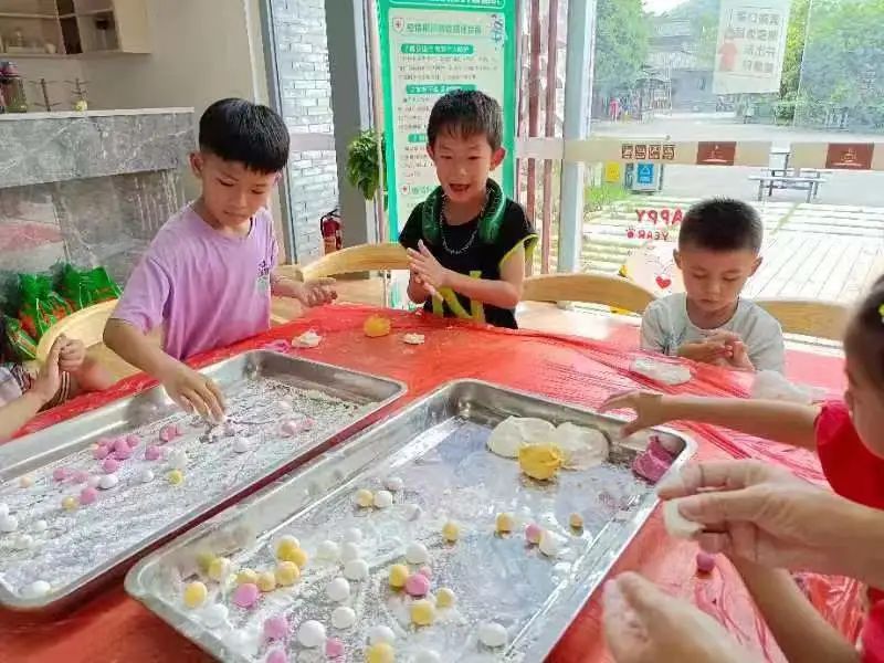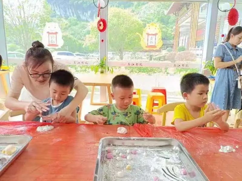 非遗美食现场制作体验活动在荔江湾景区非遗美食体验馆进行,参与人员分成7个组,每个组选出代表制作1-2道非遗美食,此时,一场别开生面的美食制作活动就开始了,组员代表在厨艺上大显身手,其他成员在旁观摩学习、情绪高涨,同时,小朋友也不甘落后地在另一边学着家长教的方法,认真地搓面团,制作汤圆。虽然这些汤圆大小不一,但丝毫不影响他们参与的热情,提高了孩子们的动手能力。