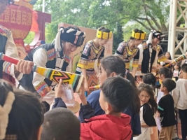国家级非遗瑶族长鼓舞巡游,用铿锵鼓点奏响文化传承的乐章。6人表演队每日4场巡游,灵动的舞步与激昂的鼓声交织,将瑶族“万物有灵”的信仰生动呈现。
