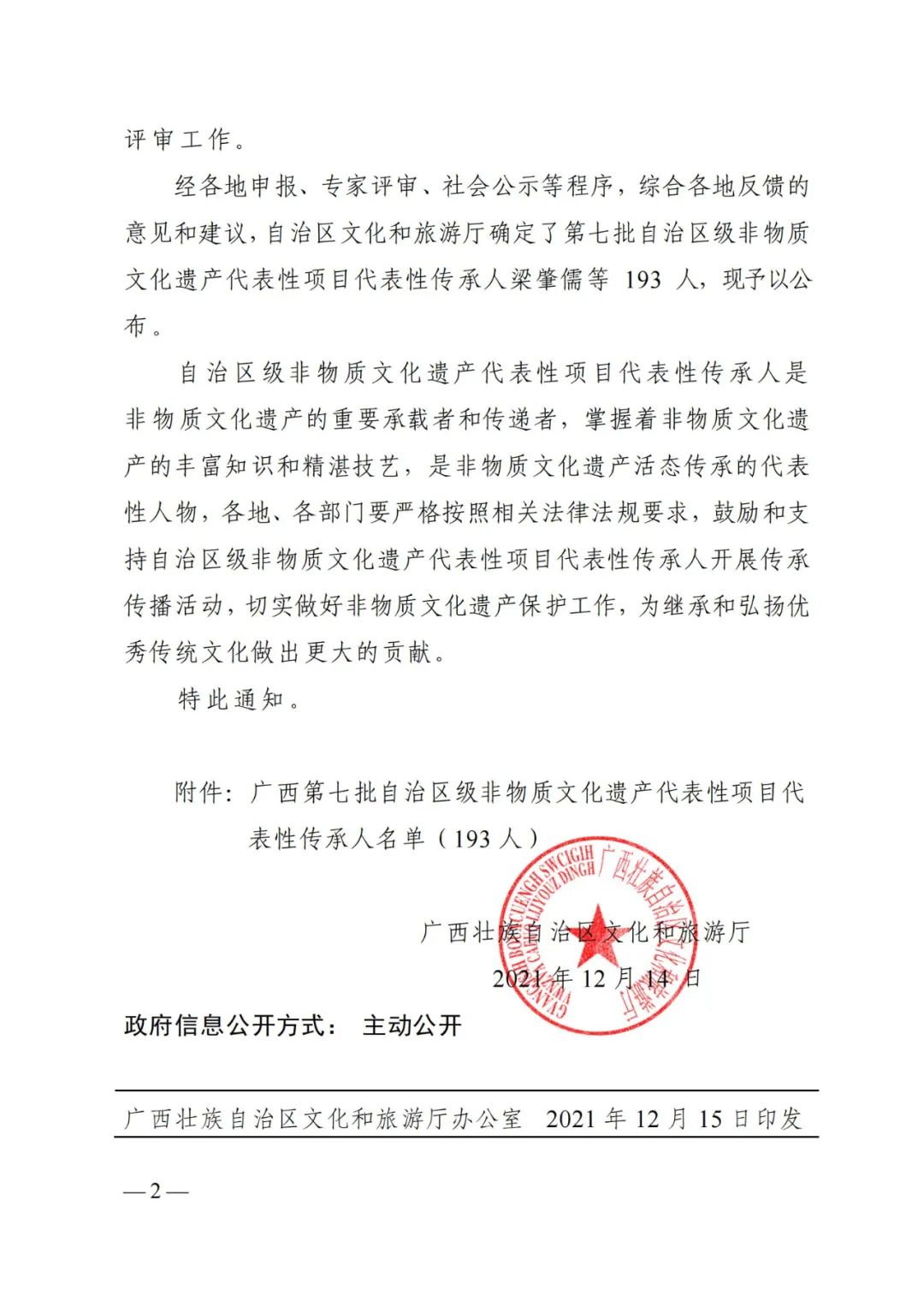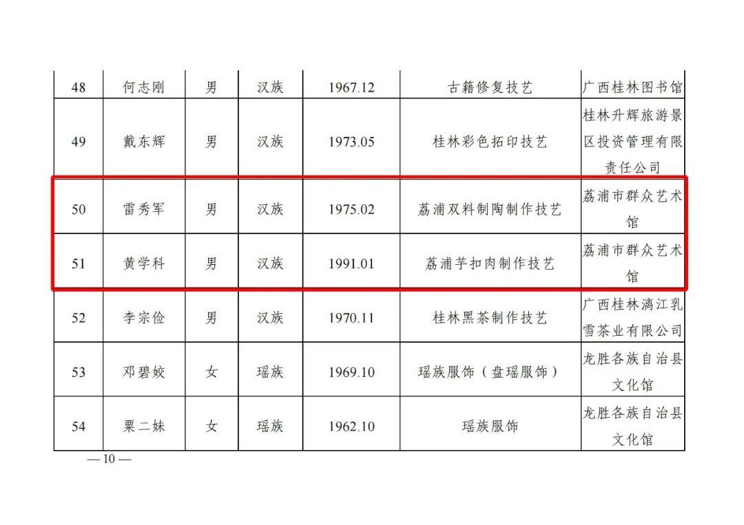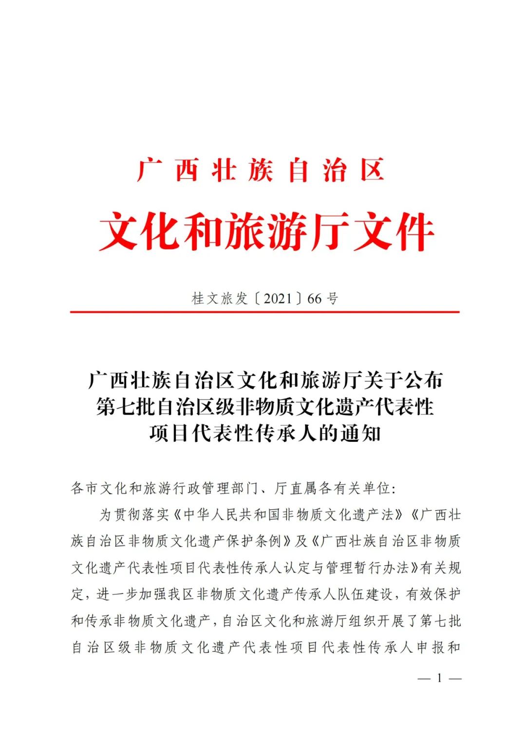 黄学科、雷秀军荣获“广西壮族自治区第七批区级非物质文化遗产项目代表性传承人”称号