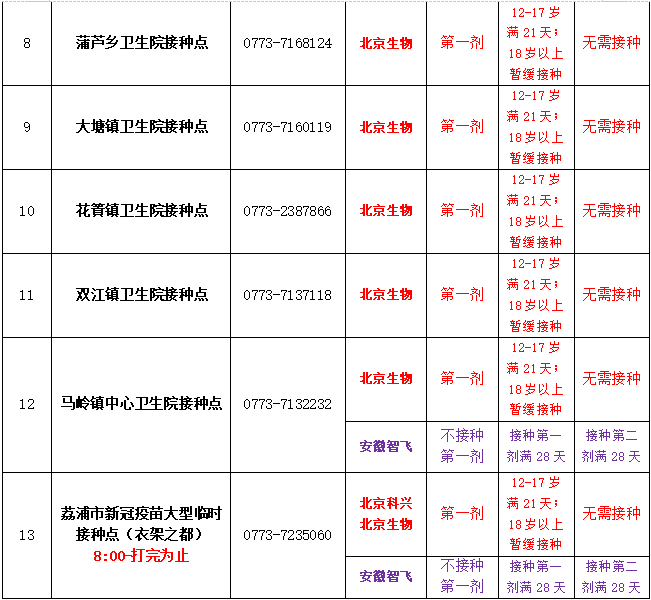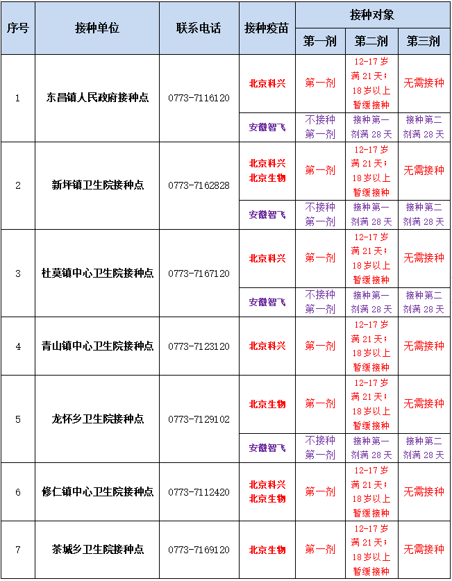 8月24日,我市有一批安徽智飞CHO细胞、北京科兴、北京生物(成都生物、兰州生物、长春生物)新冠病毒疫苗接种。具体疫苗接种点及接种疫苗种类详见下表: