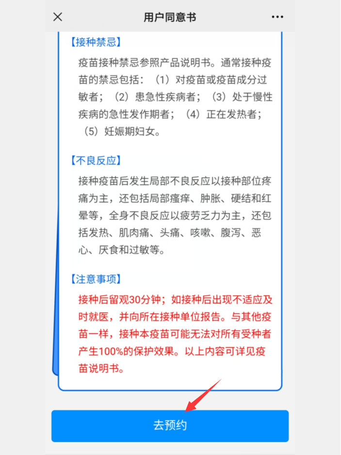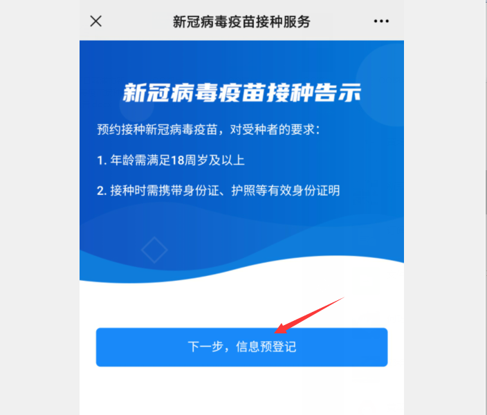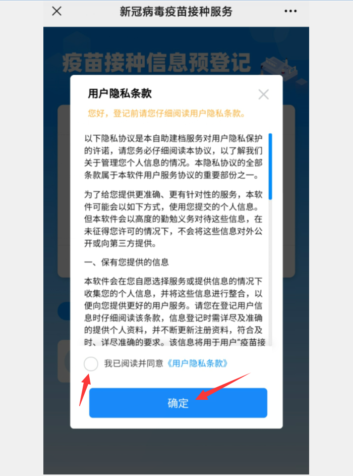 第二步:依次阅读“新冠疫苗接种告示”、“用户隐私条款”,并进行个人信息预登记。