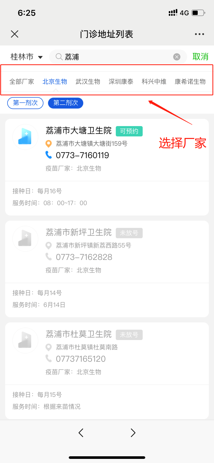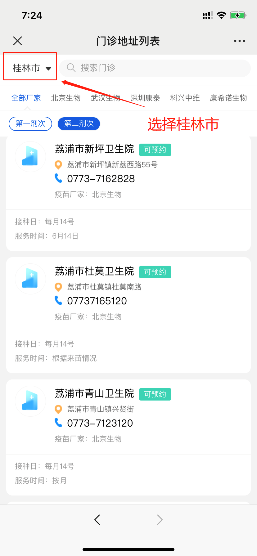 门诊地址选择桂林市即可,不用选到荔浦市,在搜索门诊处输入“荔浦”可快速搜索到荔浦市各接种点。