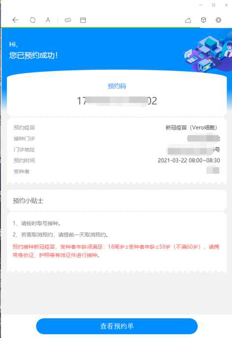 预约成功,生成预约码。请务必截图保存,避免到达接种现场后,因网络异常无法出示预约成功界面。