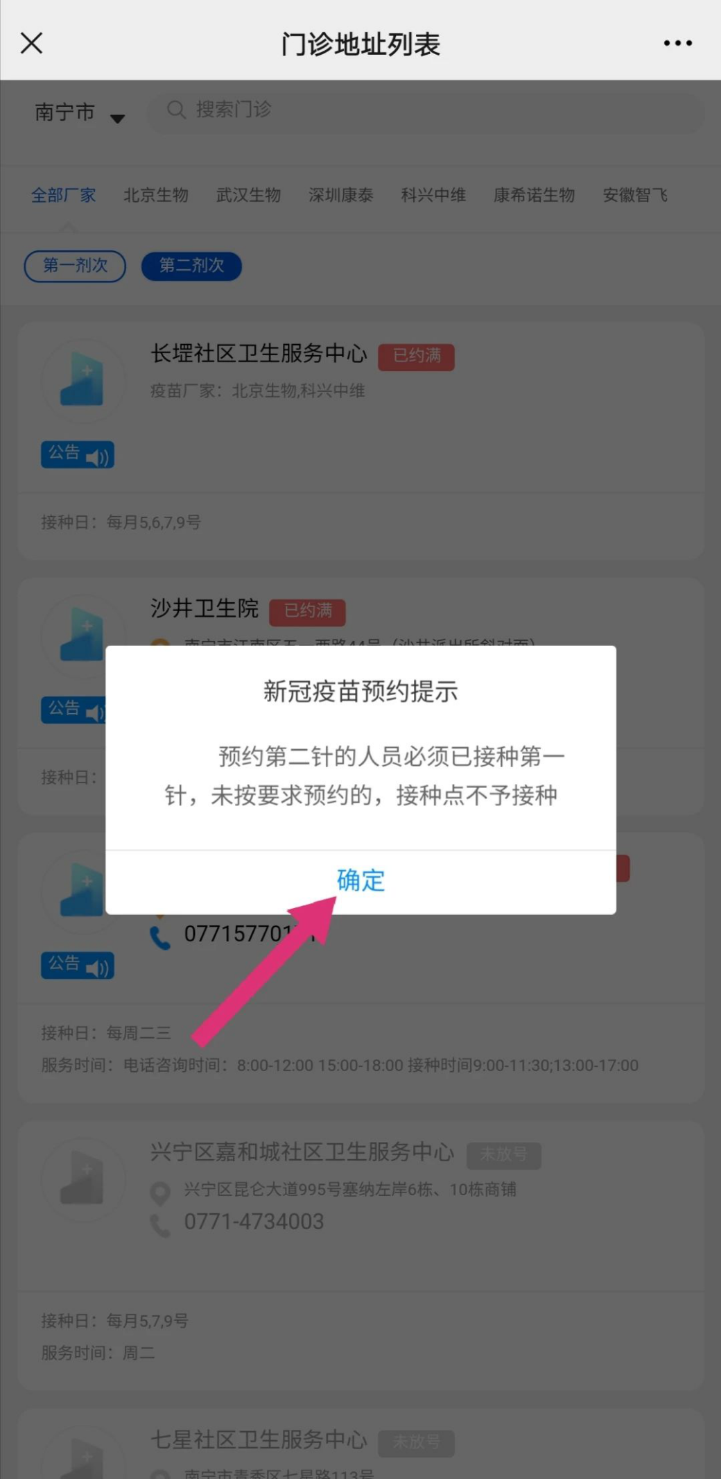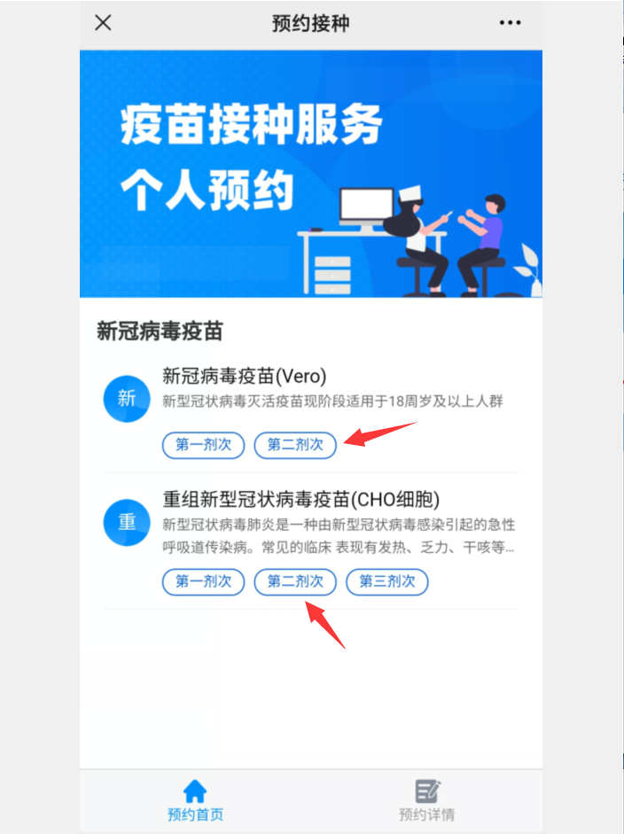 开始预约,点击“个人预约”,根据个人居住地址就近选择接种单位,选择接种单位有疫苗的生产厂家,选择第二剂次。