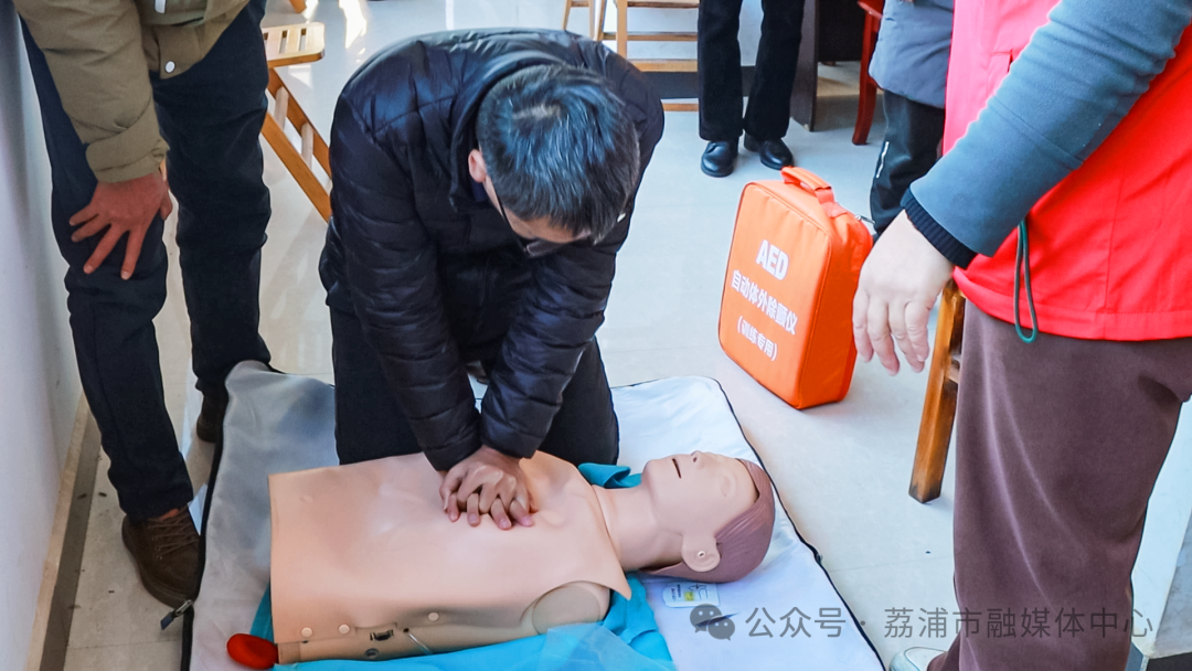 活动现场,授课老师对心肺复苏、海姆立克急救等知识进行理论讲解,使用模拟人进行心肺复苏实操演练,让参与的居民亲自操作,掌握正确的按压位置、力度及施救方法。现场还演示了AED的使用方法,对海姆立克急救法进行实操演练。
