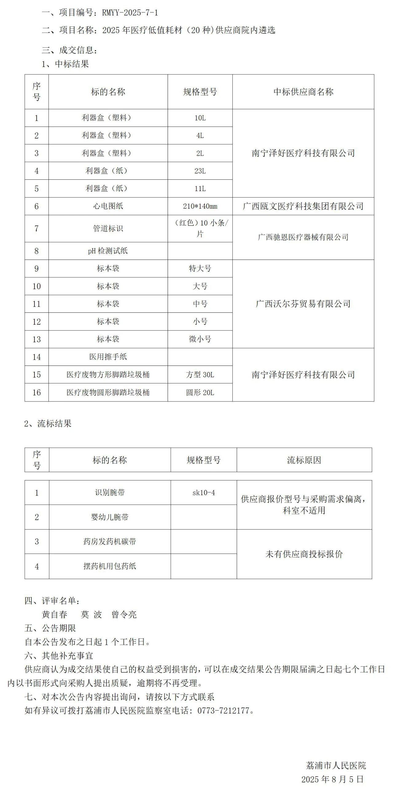 荔浦市人民医院2025年医疗低值耗材(20种)供应商院内遴选项目评标结果公告