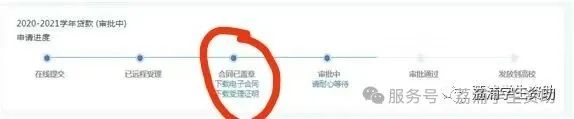 3.提出续贷申请后,首页会有贷款申请进度,当申请进度显示“合同已盖章/下载电子合同、下载受理证明”(如下图)时,说明县级资助中心已审核通过,学生会收到国家开发银行发送带有回执验证码的短信,可以将回执验证码上报学校,也可以自行打印合同及受理证明。