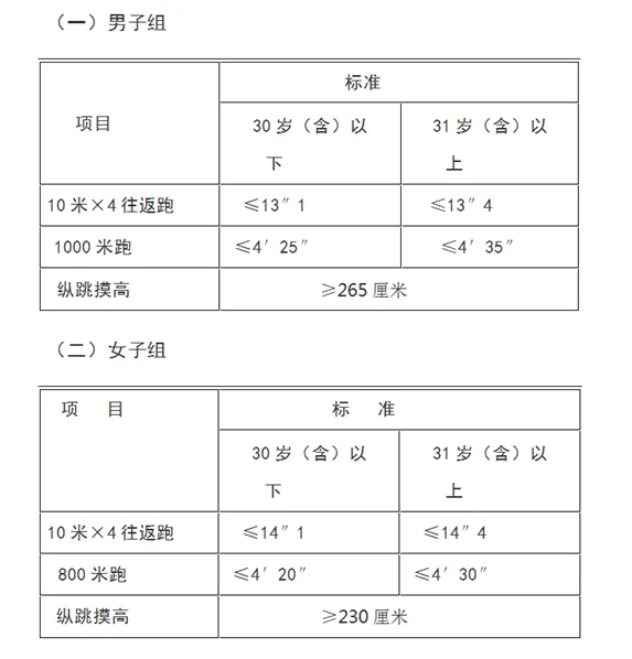 4.报考人员须参加全部三项体能测评,全部达标方为合格,如放弃一项则视为不合格,体能测评合格的方可进入下一环节。