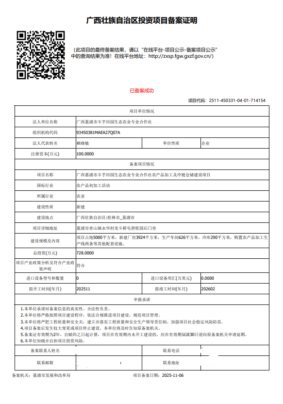 广西荔浦市丰芋田园生态农业专业合作社农产品加工及冷链仓储建设项目