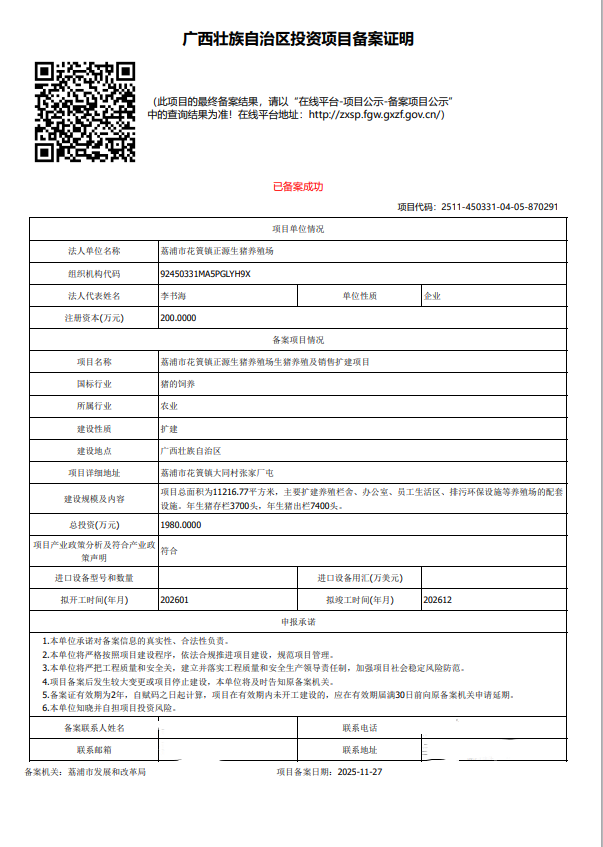 荔浦市花篢镇正源生猪养殖场生猪养殖及销售扩建项目