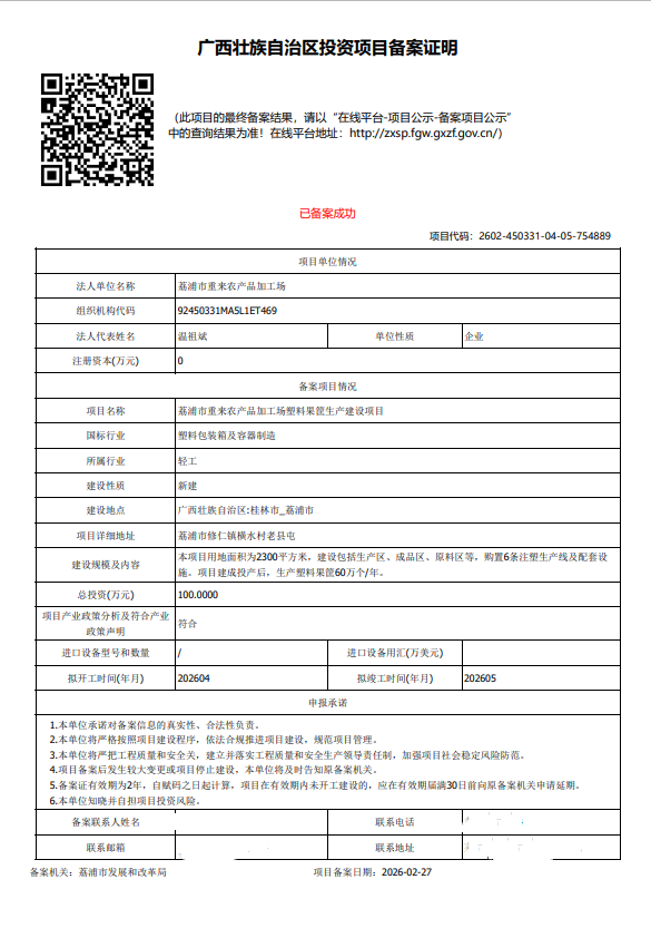荔浦市重来农产品加工场塑料果筐生产建设项目