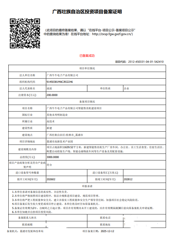 广西牛牛电子产品有限公司智能售卖机建设项目