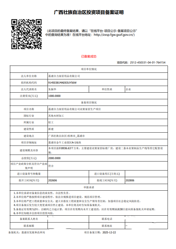 荔浦合力家居用品有限公司衣架家居生产项目