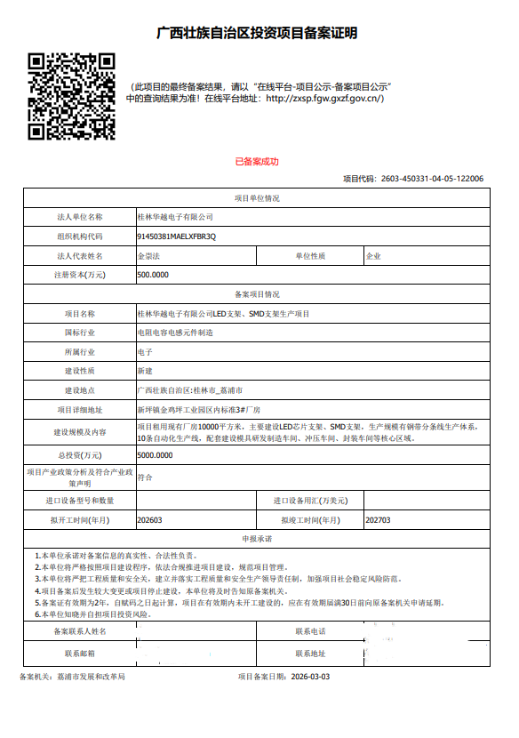 桂林华越电子有限公司LED支架、SMD支架生产项目