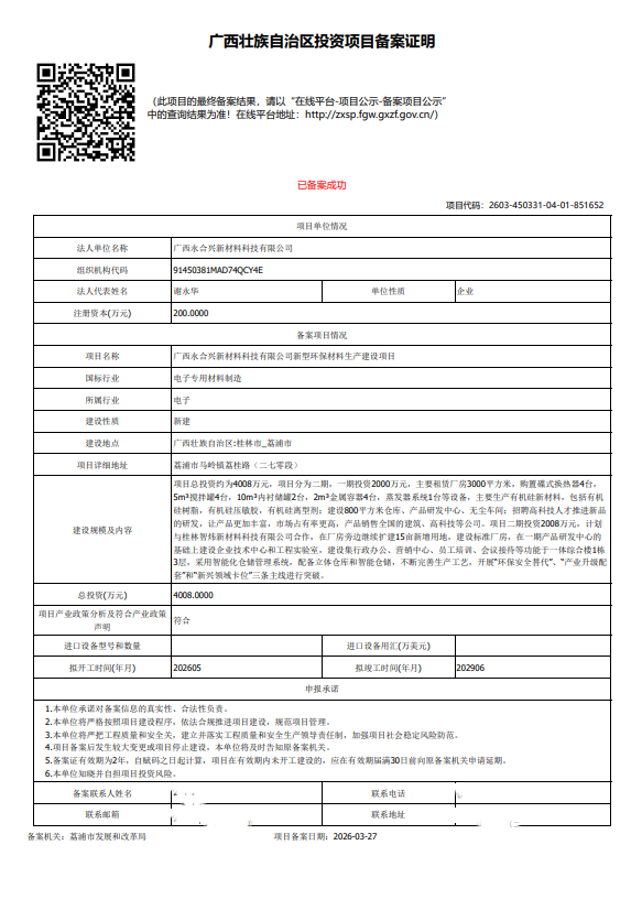 广西永合兴新材料科技有限公司新型环保材料生产建设项目