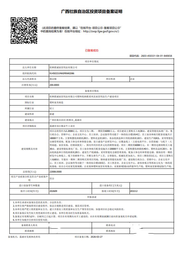 桂林联诚家居用品有限公司塑料收纳箱及家居用品生产建设项目