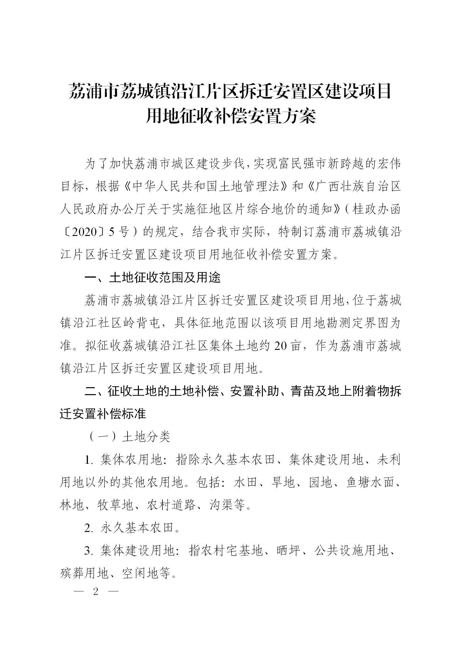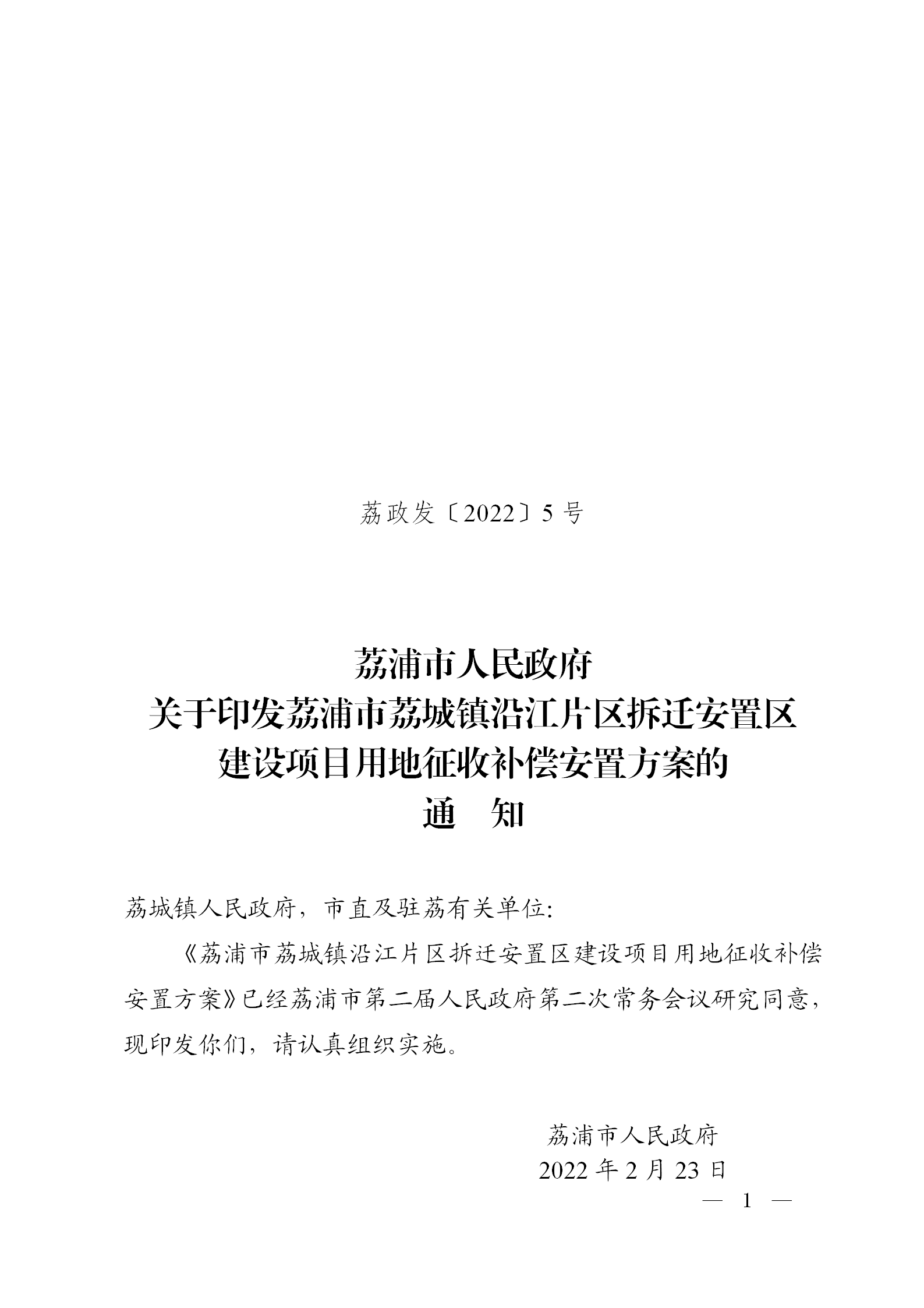 荔政〔2022〕5号关于印发荔浦市荔城镇沿江片区拆迁安置区建设项目用地征收补偿安置方案的通知