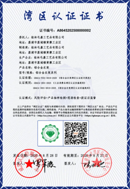 “衣架之都”荔浦迎来高质量发展新标志。近日,桂林毛嘉工艺品有限公司研发的高端铝合金衣架系列产品,成功获得粤港澳大湾区认证机构颁发的认证证书,这是荔浦市首张“湾区认证”证书,意义非凡。