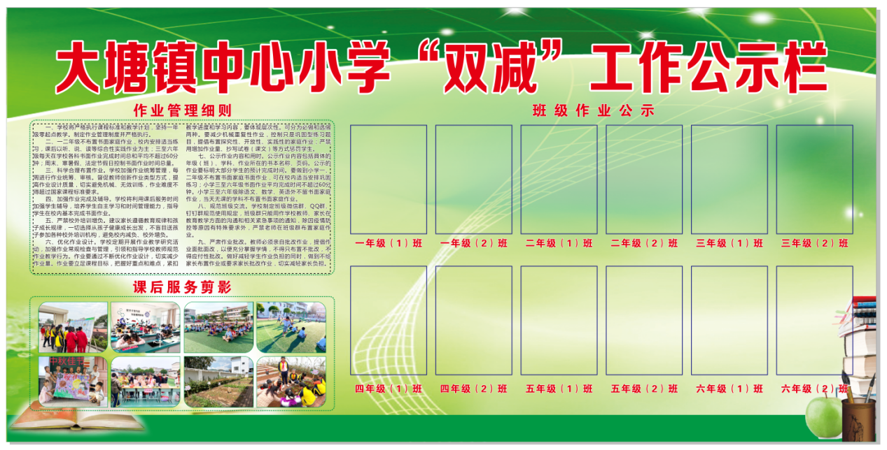 大塘镇中心小学积极落实“双减”政策,努力探索分学科“基础+弹性”分层作业模式,基础性作业重在培养学生习惯的养成;“弹性作业”尊重学生的个性化差异,以综合性、实践性、拓展性作业为主,重视对学生综合素质和实践能力的培养,灵活要求,供学生自主选择,让每个学生在适应自己的作业中取得成功。修订并严格落实班主任统筹总量、年级组长把控质量,教务处审核公示的《大塘镇中心小学学生作业审查公示制度》作业管理制度。“把时间还给孩子,把健康还给孩子,把能力还给孩子”,确保减负提质增效,培养学生的综合能力。