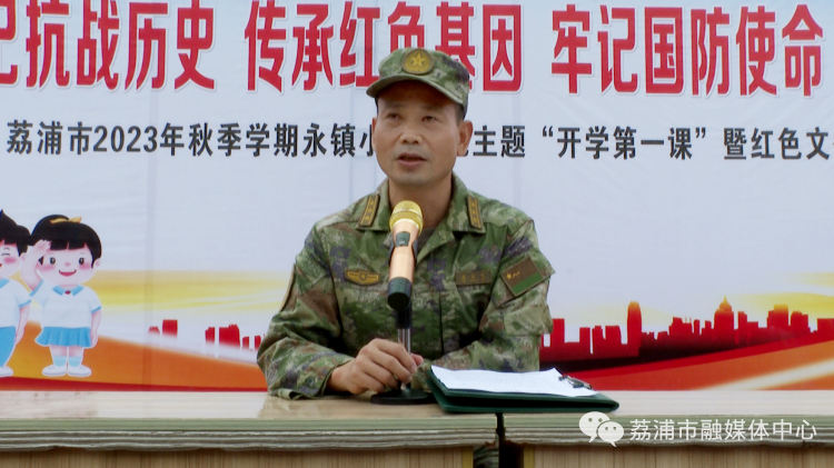 8月28日,荔浦市委常委、市人武部部长凌传飞到青山镇永镇小学开展国防教育活动,为学生们上好“开学第一课”。